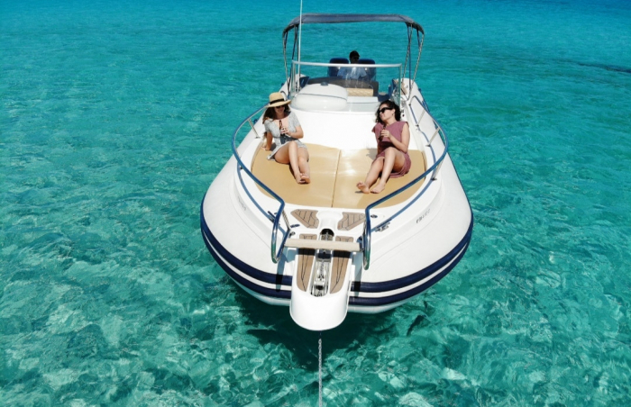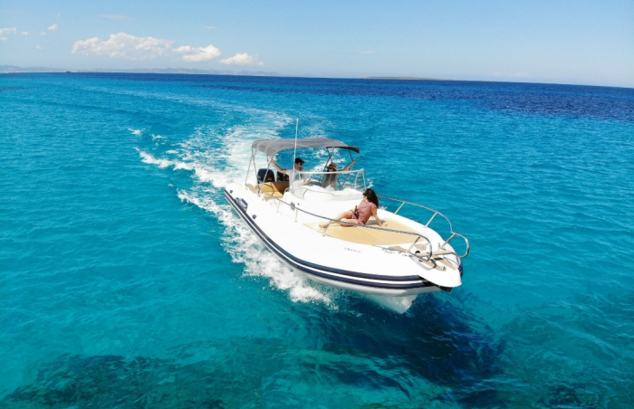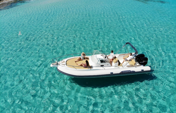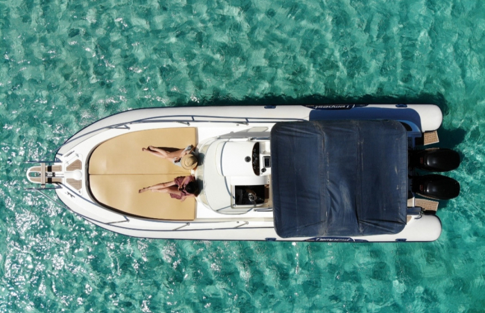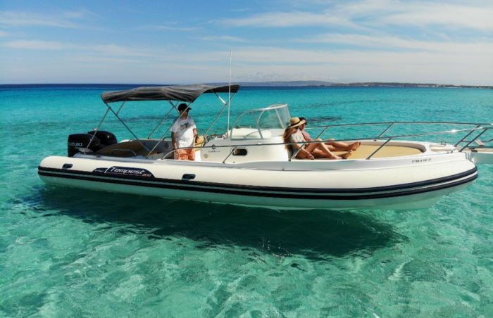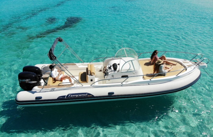 Capelli 900 Tempest with a capacity of 11 people a large solarium in the bow is perfect to enjoy the best natural spots of the island. Covered cabin with WC, 9m long and 3.15 meters wide, bathing platform with ladder, music with bluetooth and fresh water shower you have the option to hire with or without captain.