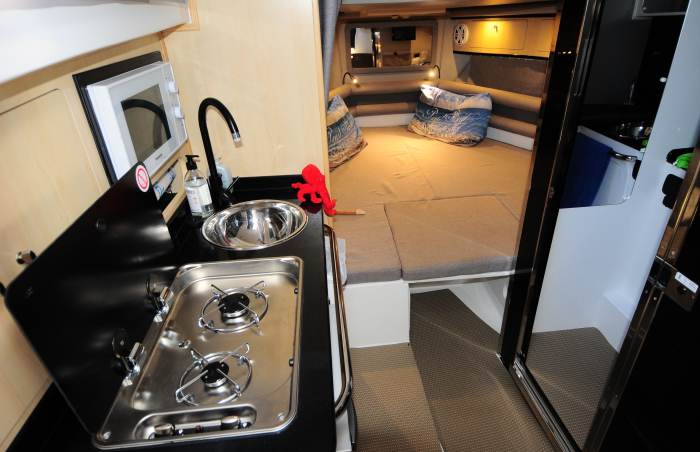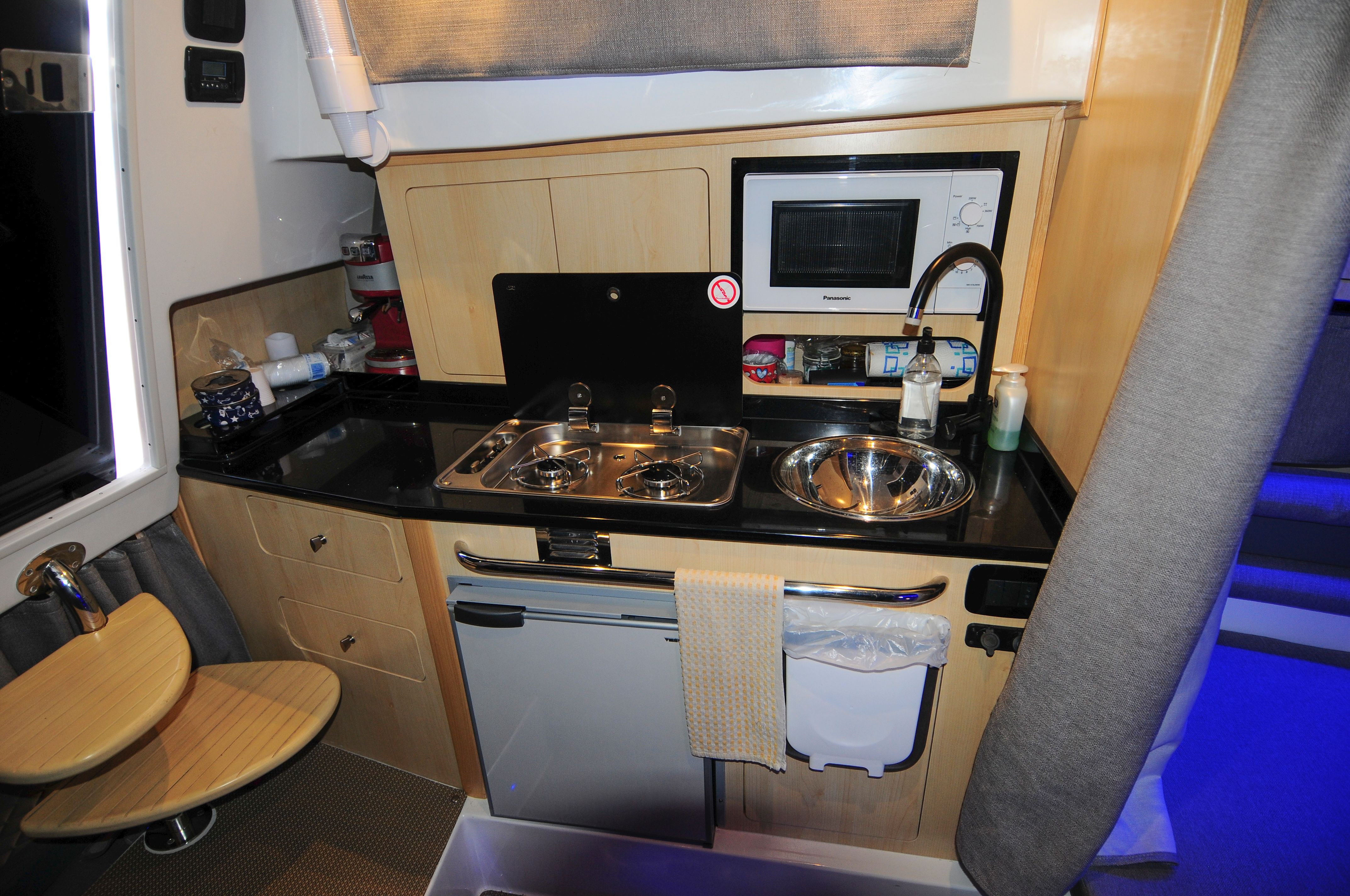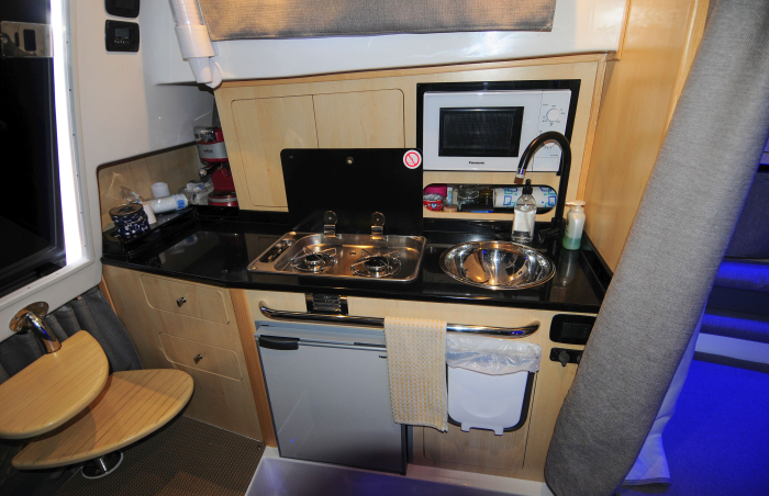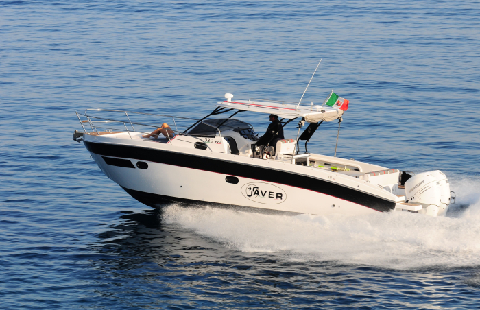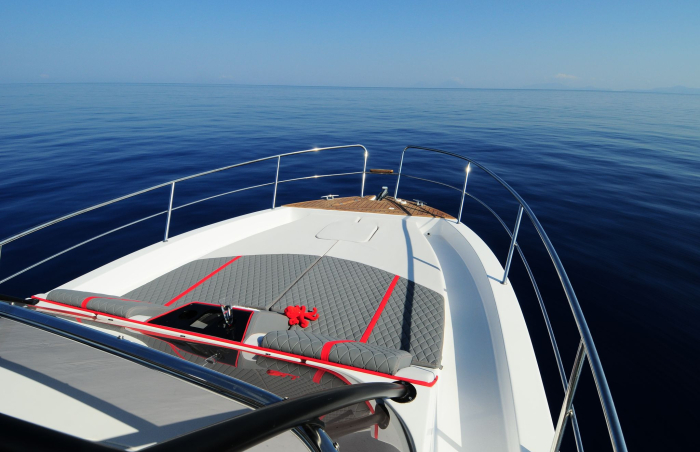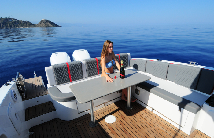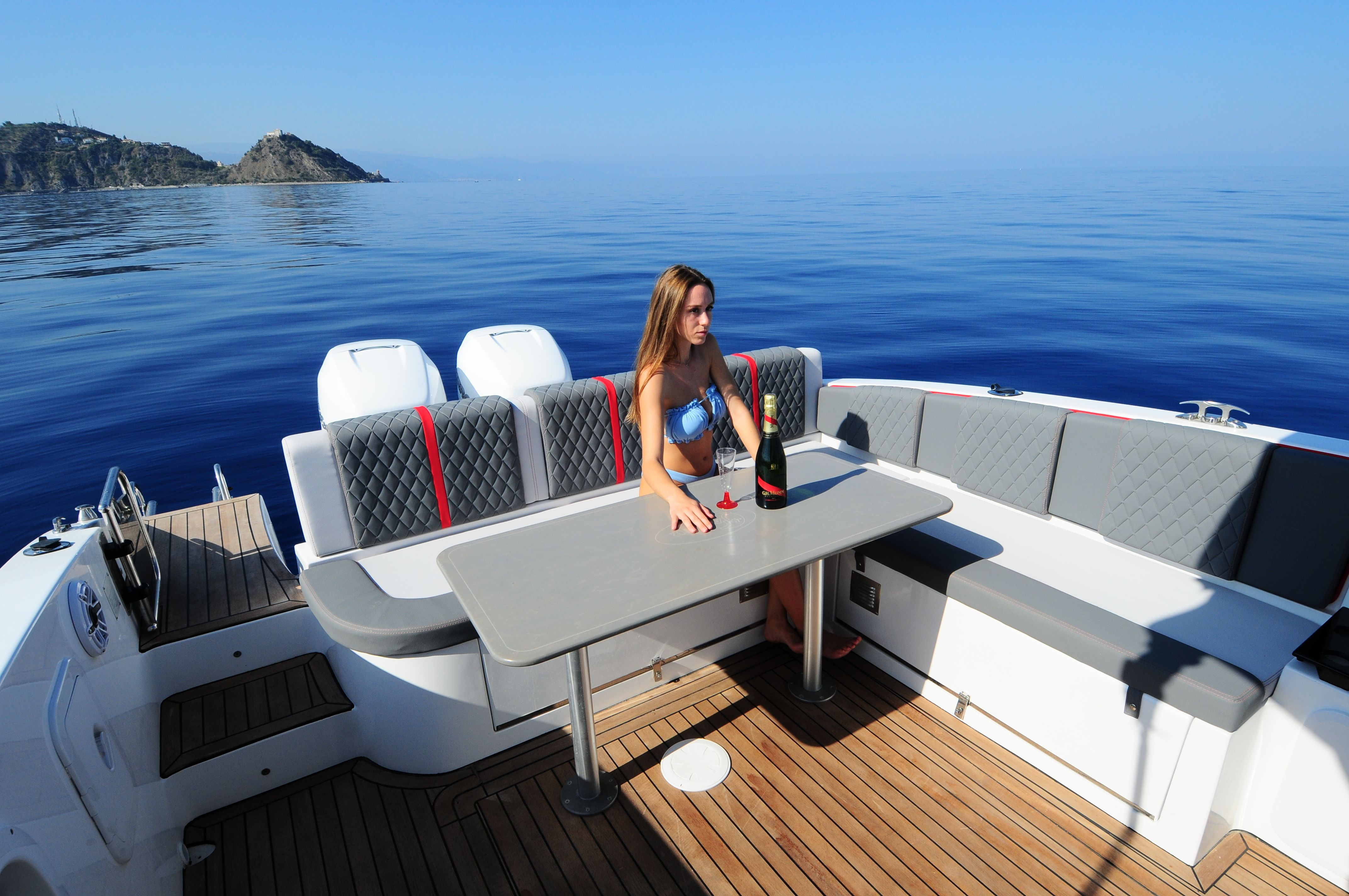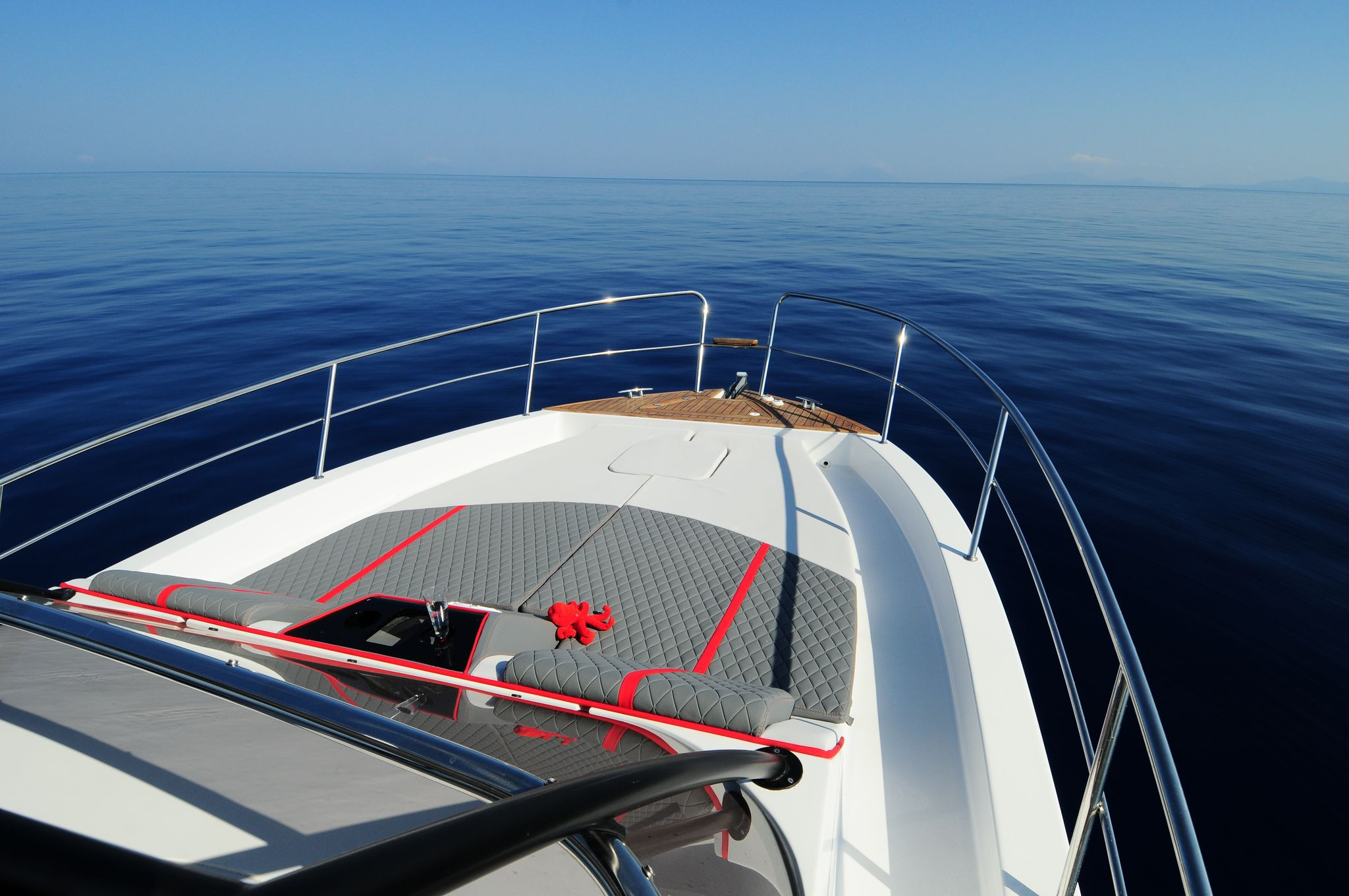 This boat features a remarkably high-performance hull that delivers exceptional speed and comfort as you cruise along. The extensive outdoor spaces provide ample room for a splendid day out, complemented by a capacious cabin. The luxurious aft section features an L-shaped sofa with trendy backrests and a table that serves as a sun-lounger. At the bow, relax on the huge sun deck replete with ergonomically designed chaise longue backs. The console is equipped with cutting-edge technology and roomy enough to accommodate the most comprehensive onboard instrumentation.