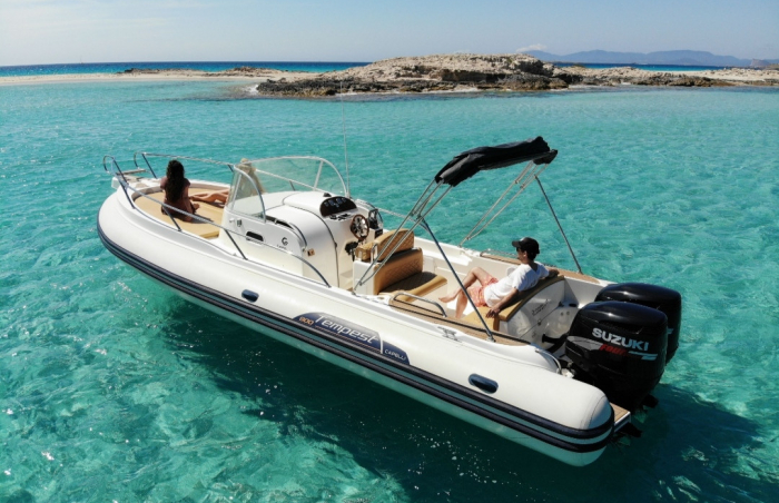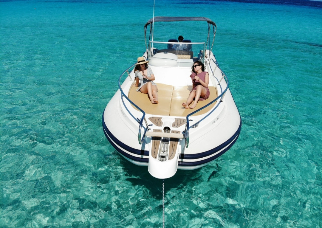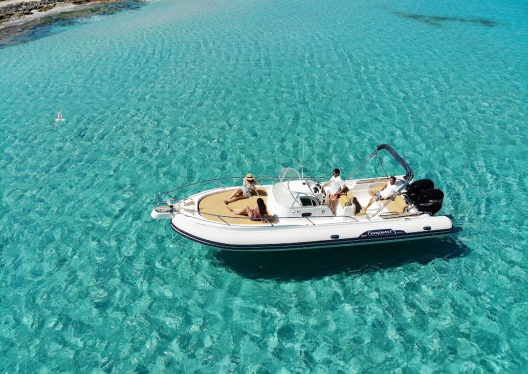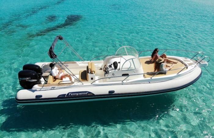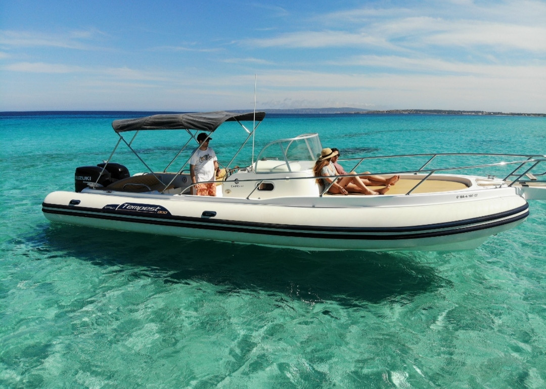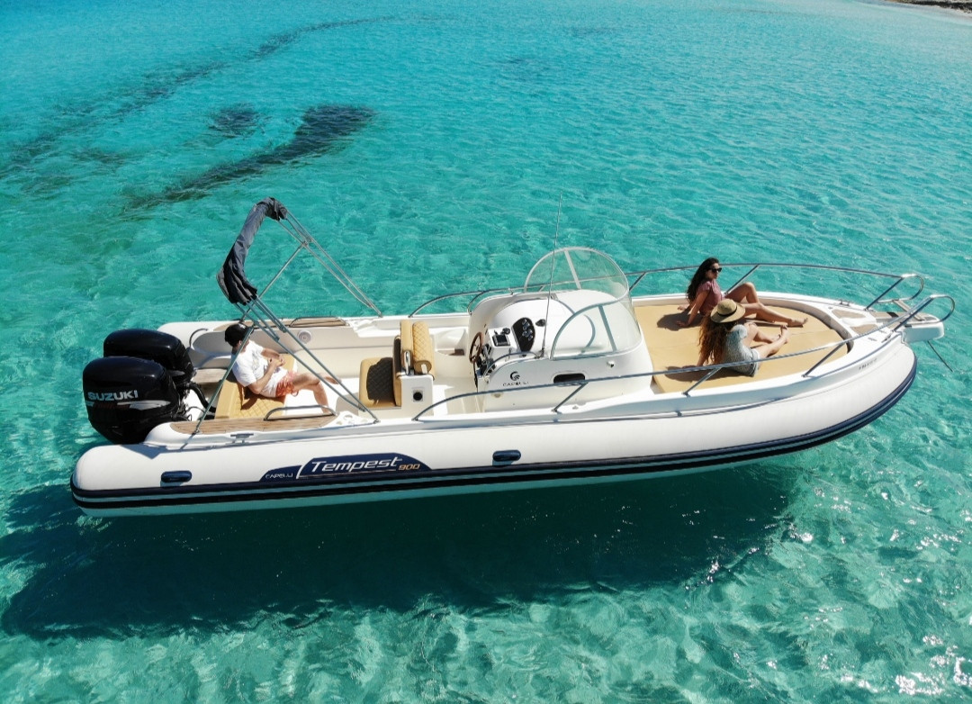 Capelli 900 Tempest with a capacity of 11 people a large solarium in the bow is perfect to enjoy the best natural spots of the island. Covered cabin with WC, 9m long and 3.15 meters wide, bathing platform with ladder, music with bluetooth and fresh water shower you have the option to hire with or without captain.