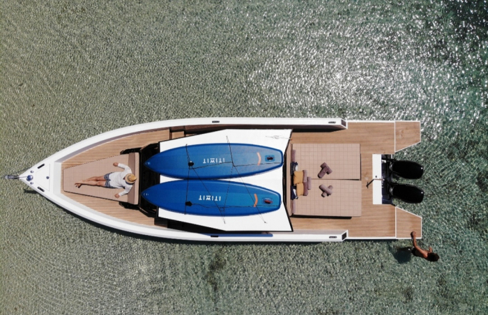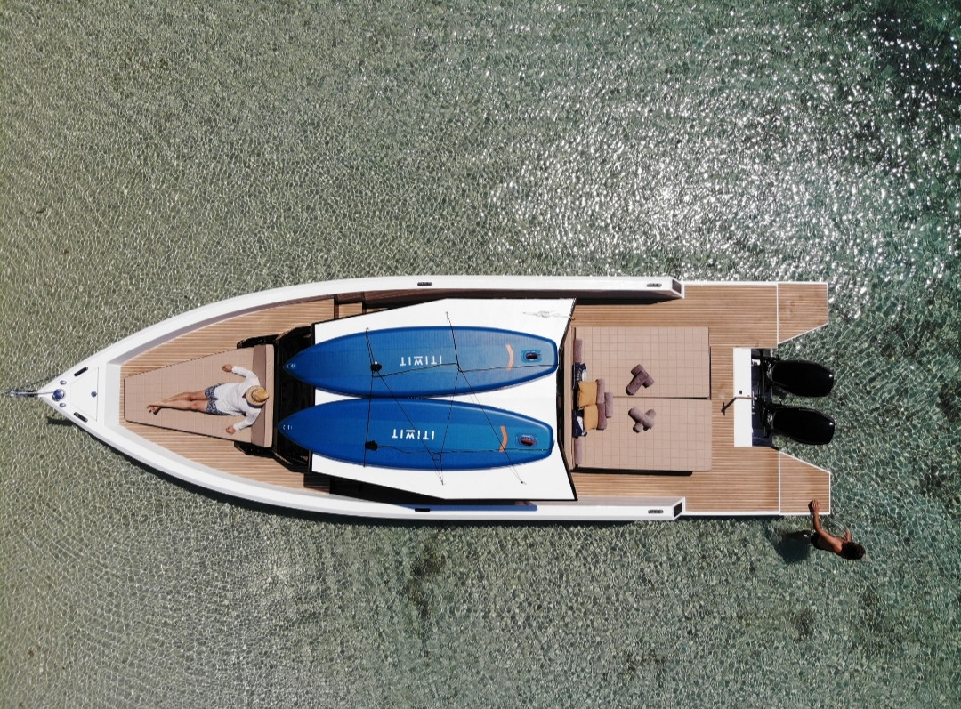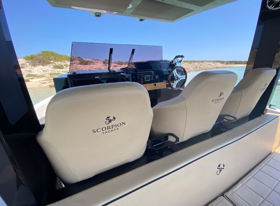Scorpion 40 Beach Club, manufactured in 2021 with a bathtub very confortablea ans an open sides to jump into the sea to enjoy the amazing mediterranean clear waters. Two Suzuki 300cv to navigate comfortable in difficult swell conditions.