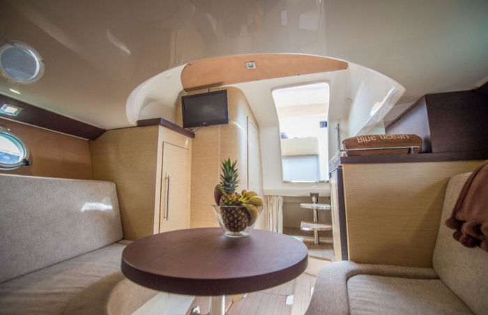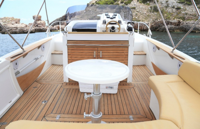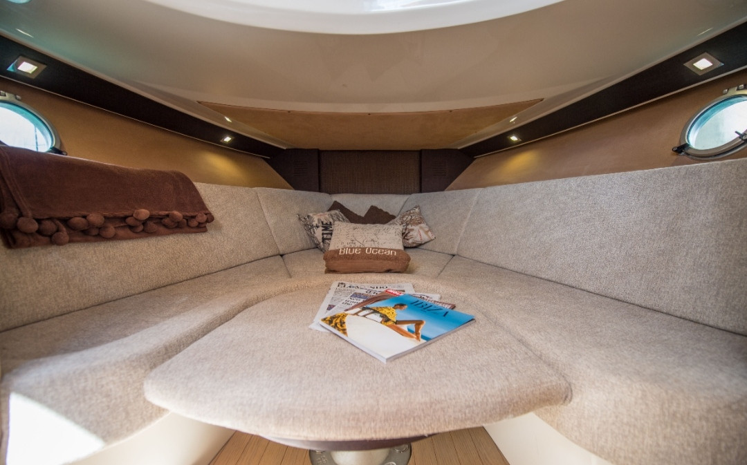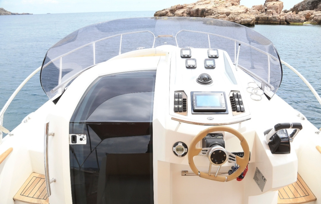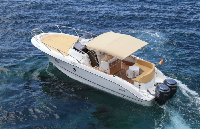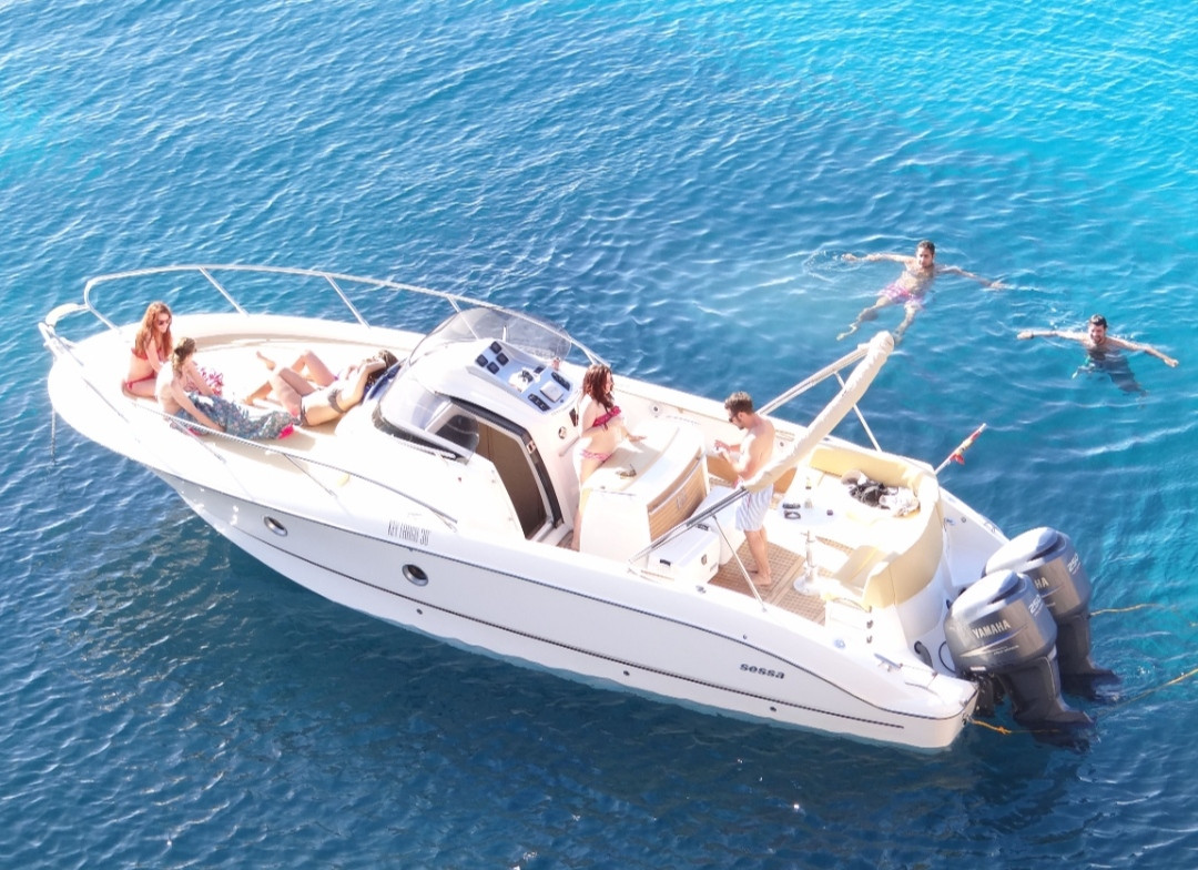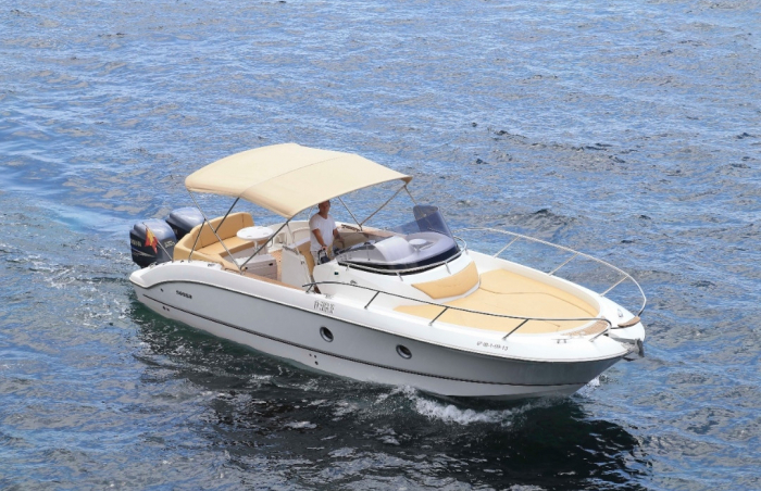 This 10 meter long boat it is equipped with 2 outboard Yamaha engines for a total of 500 horsepower. It have a bathroom, double cabin (with extra bed), hot water and shower at the stern it also have VHF radio and plotter and an incredible huge bow solarium.