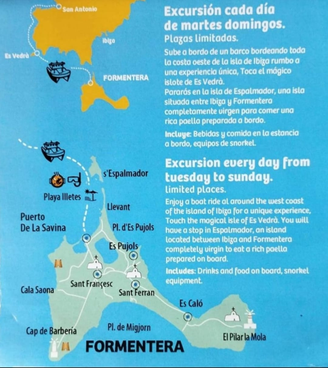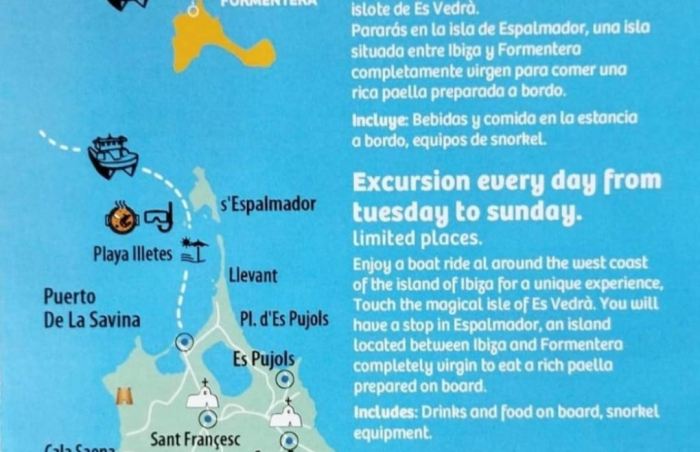 | San Antonio | 8H30 | From 9 am untill Sunset | Breakfast, Lunch, Tapas, Drinks | Es Vedra + Es palmador +. Formentera | Snorkeling |
